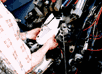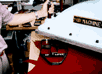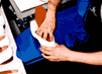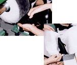 インソール(中底)を打ち付けたラスト(木型)にアッパー(甲革)をかぶせ、ラスター(トゥ、サイド、ヒール)で吊り込み、底面をバフ(銀面を削る)し、本底を貼り付けます。 |